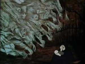But the real star here is the animation, which was inspired by illustrations in early editions of the book (especially the Victorian era drawings of John Leech). The images are lugubrious and scary yet hard to look away from, not unlike Goya’s Pinturas Negras. I first saw this film as a child and the visual of “ignorance and want” haunted my imagination for years. The film makers accentuate the power of the animation by employing arresting pan and zoom shots that are extremely effective both as storytelling devices and as setters of mood.